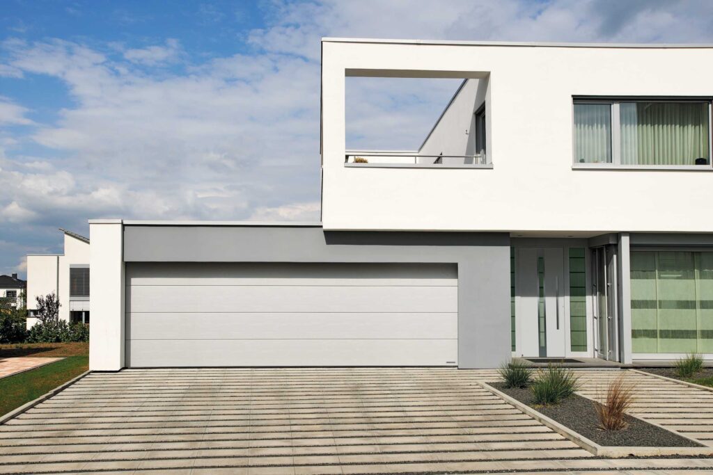 Sektionaltore bestehen aus mehreren miteinander verbundenen Einzelelementen und öffnen senkrecht. Dieses Konstruktionsprinzip erlaubt eine nahezu volle Durchfahrt in Höhe und Breite und das Tor liegt bei Öffnung platzsparend unter der Garagendecke. Dadurch gewinnen Sie mehr Platz vor und in der Garage.